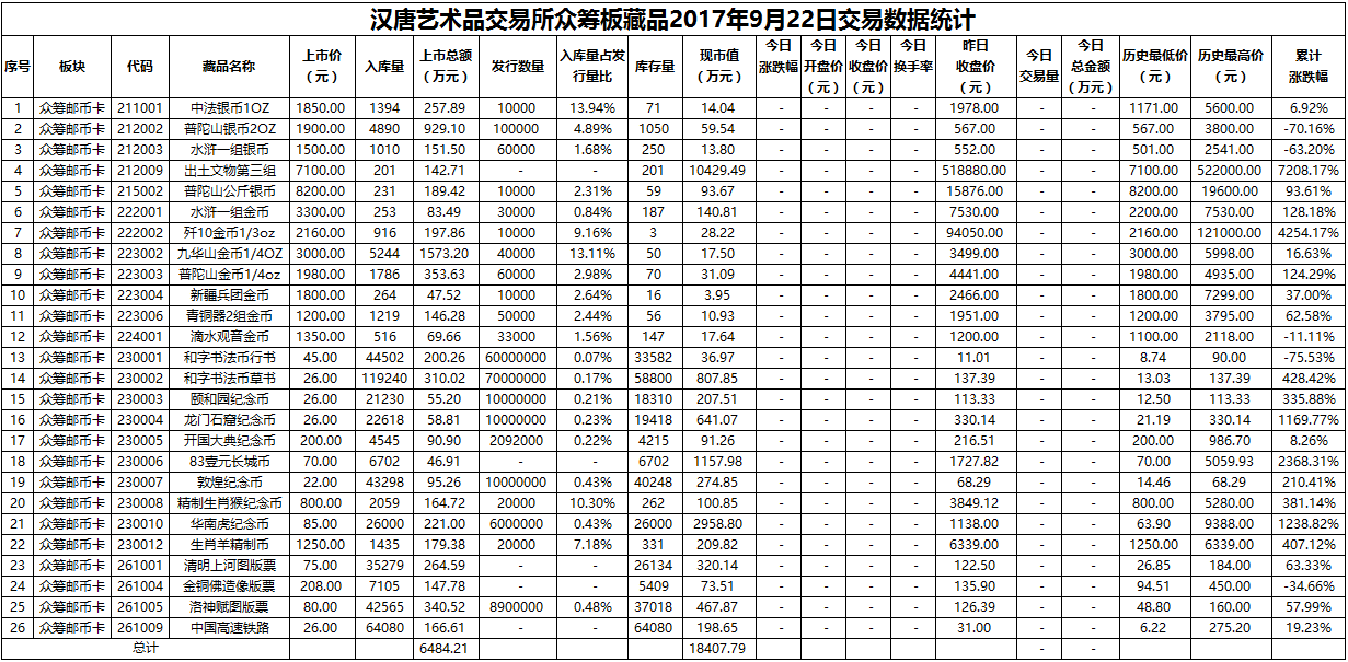 汉唐艺术品交易所众筹板藏品2017年9月22日交易数据统计
