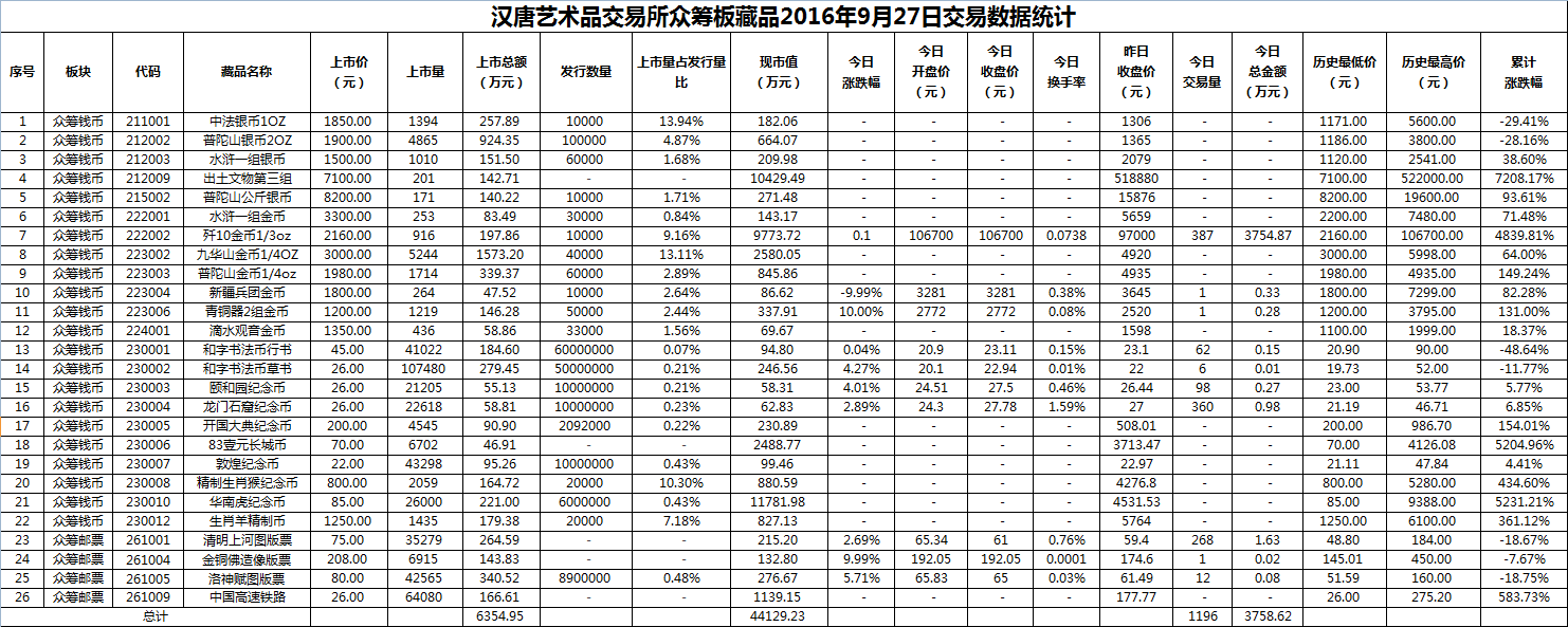 汉唐艺术品交易所众筹板藏品2016年9月27日交易数据统计